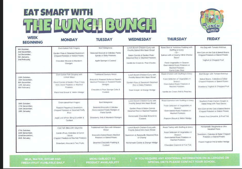 Our dinners are prepared in Holy Trinity Primary School and served by our dinner lady Mrs Hughes. Our dinners each day follow an four week menu. Below is a picture of this menu.